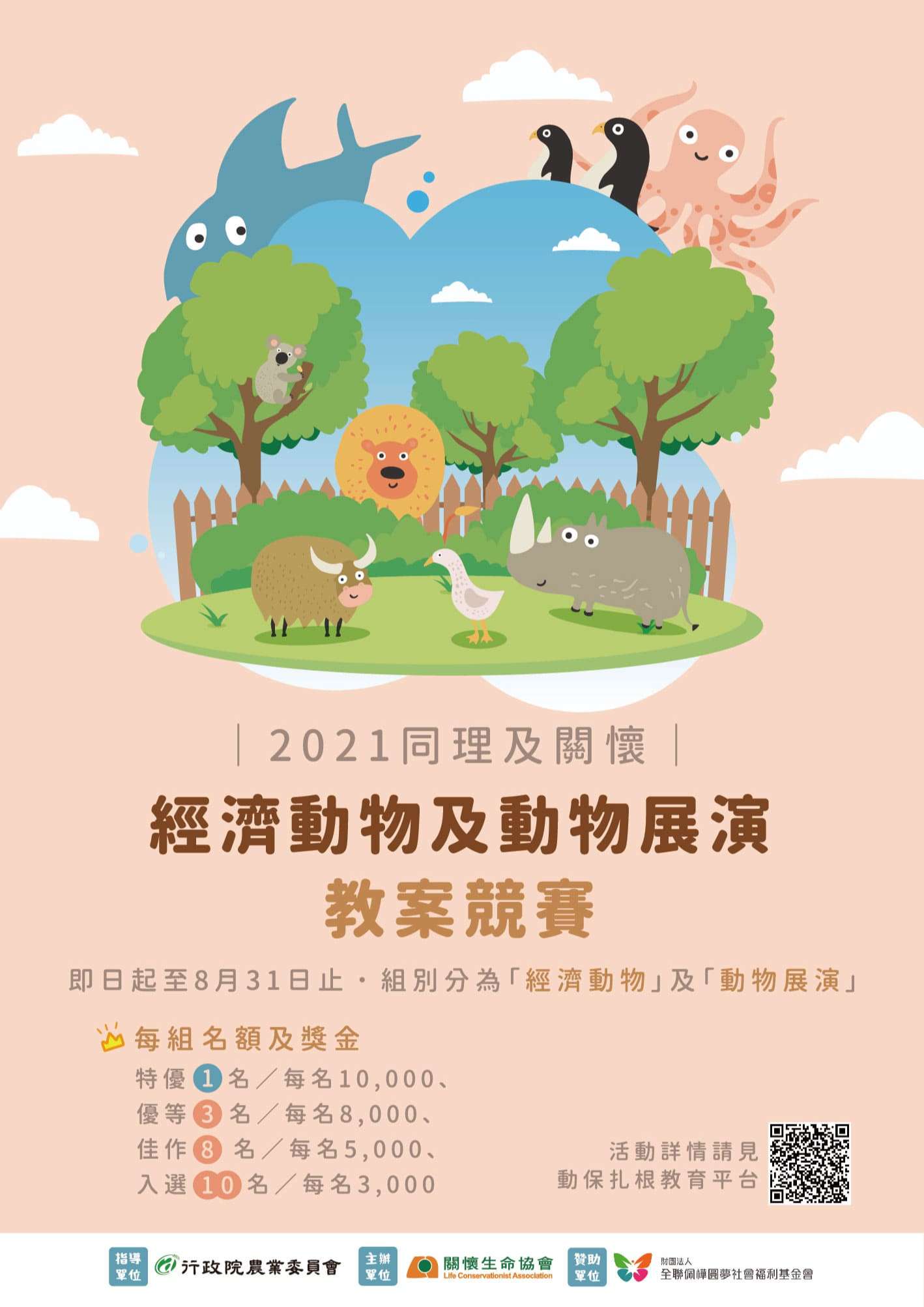二、為鼓勵教師發展「經濟動物」及「動物展演」議題之動物 保護教學活動,促進落實動保教育,邀請所有教師夥伴踴 躍分享教學設計及經驗。 本活動資訊略述如下: (一)組別與獎勵 1、組別:分為「經濟動物」及「動物展演」兩組,可同 時報名。 2、名額:兩組分別選出特優1名、優等3名、佳作8名及入 選10名。 3、獎勵: (1)特優:頒發獎金10,000元及獎狀乙張。(2)優等:頒發獎金8,000元及獎狀乙張。 (3)佳作:頒發獎金5,000元及獎狀乙張。 (4)入選:頒發獎金3,000元及獎狀乙張。 (二)參加對象:全國各公私立幼兒園、國民中小學及高中教 師、代理教師、代課教師、實習教師及正修習教育學程 的職前教師,以及有興趣從事動物保護教育者。 (三)報名方式 1、徵稿期間:即日起至2021年8月31日止。 2、報名資料:需繳交紙本及電子文件,紙本文件及教案 表格、其他教材等均須於8月31日前寄送並上傳,逾時 恕不採計。 (四)如對本活動有任何疑義,請洽陳立珊承辦人電話:02- 2542-0959;電子信箱:edu@lca.org.tw。