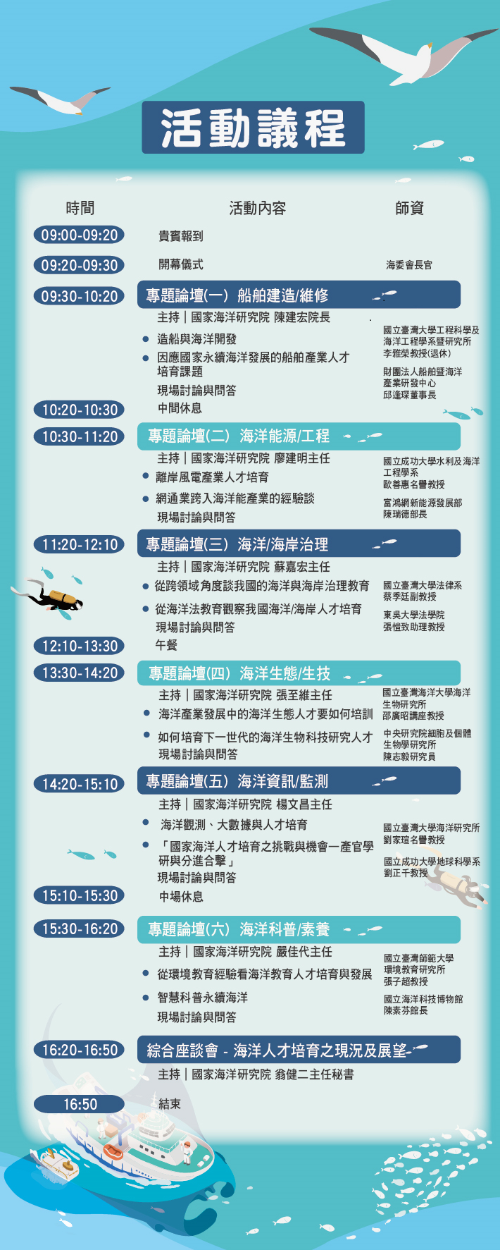 一、配合第四屆國家海洋日系列活動,國家海洋研究院特舉辦旨揭論壇,以「邁向下一個十年的永續海洋」為主題,辦理6場次專題講座(船舶建造/維修;海洋能源/工程;海洋 /海岸治理;海洋生態/生技;海洋資訊/監測;海洋科普/ 素養)進行專題分享。