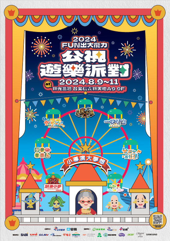 一、公視第五屆年度兒童品牌活動【FUN出大能力】公視遊樂派 對,集結公視、公視台語台、客家台旗下優質兒童節目, 今年更有新開台的生力軍小公視新製節目加入一起共襄盛 舉。【FUN出大能力】公視遊樂派對,8月9日(五)-8月11 日(日)三天,在「新光三越 台北信義新天地A9 9F」 (地址:台北市信義區松壽路9號9F)