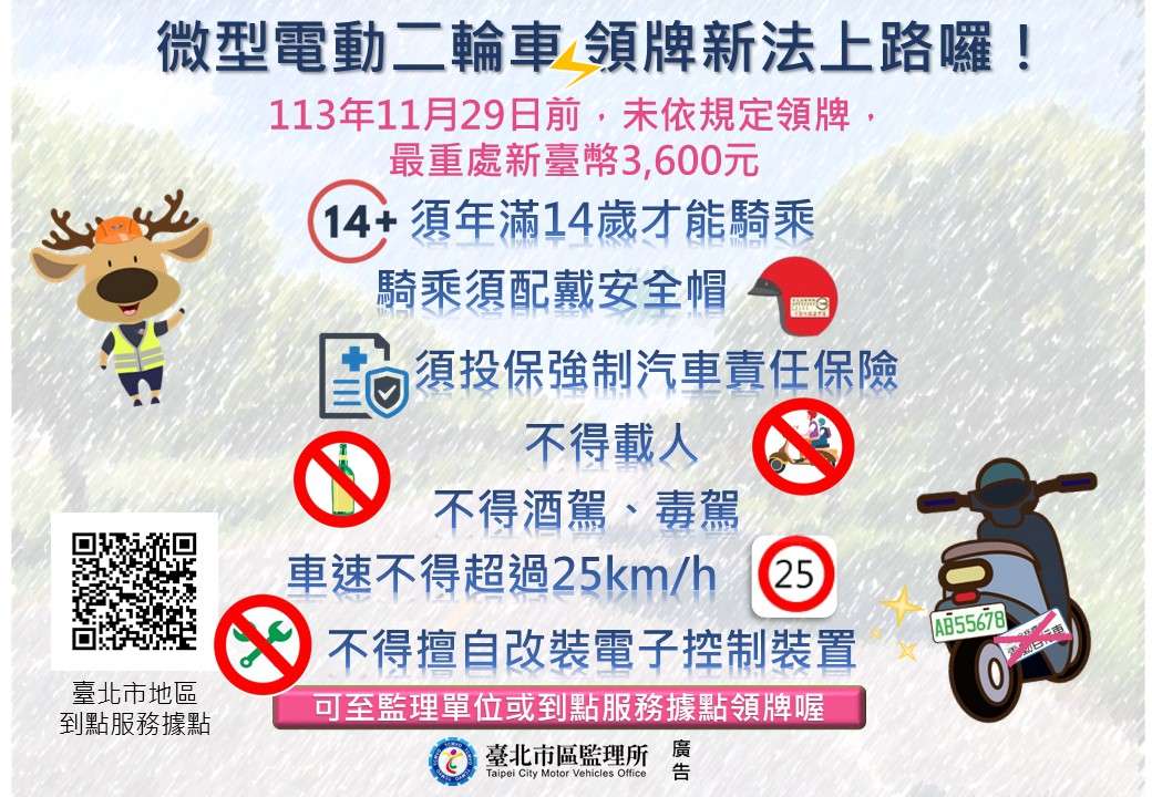 微型電動二輪車(原稱電動自行車)自113年11月30日起納 管,未掛牌上路,警方將依法取締。騎乘微型電動二輪車 應遵守之規定:駕駛人需年滿14歲,需配戴合格安全帽、 不可騎上人行道及自行車道(河濱自行車道除外)、不得 載人、最大行駛速率為25km/h以下、不得擅自改裝電子控 制裝置或原有規格、不可酒駕與毒駕,須依規定停車並遵 守交通標誌標線號誌駕駛。