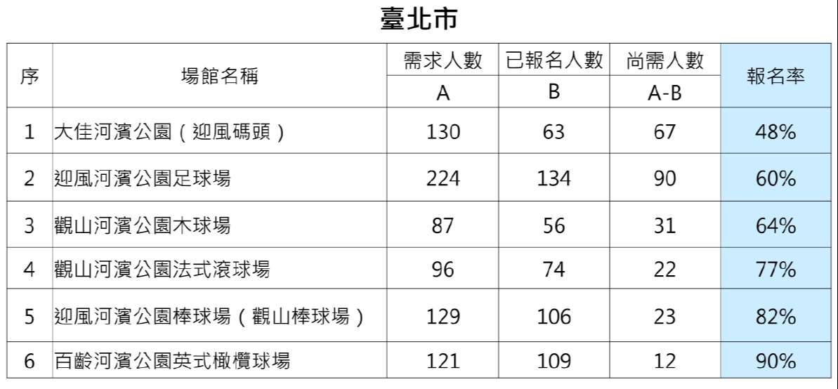 本賽會本市共有28個賽館,尚有6個場館尚有志工缺額, 請各單位積極轉知所屬人員及家眷踴躍報名擔任志工參與 盛會。