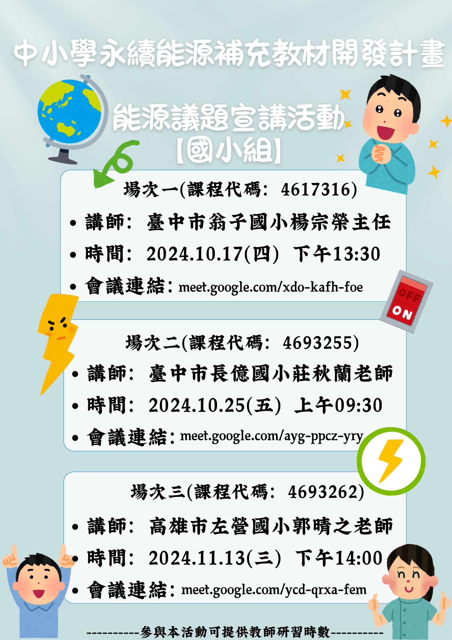 【國小組】場次一(課程代碼:4617316);講師:臺中 市翁子國小楊宗榮主任;時間:113年10月17日(星期四)下午1時30分至3時;Google Meet連結:meet. google.com/xdo-kafh-foe。