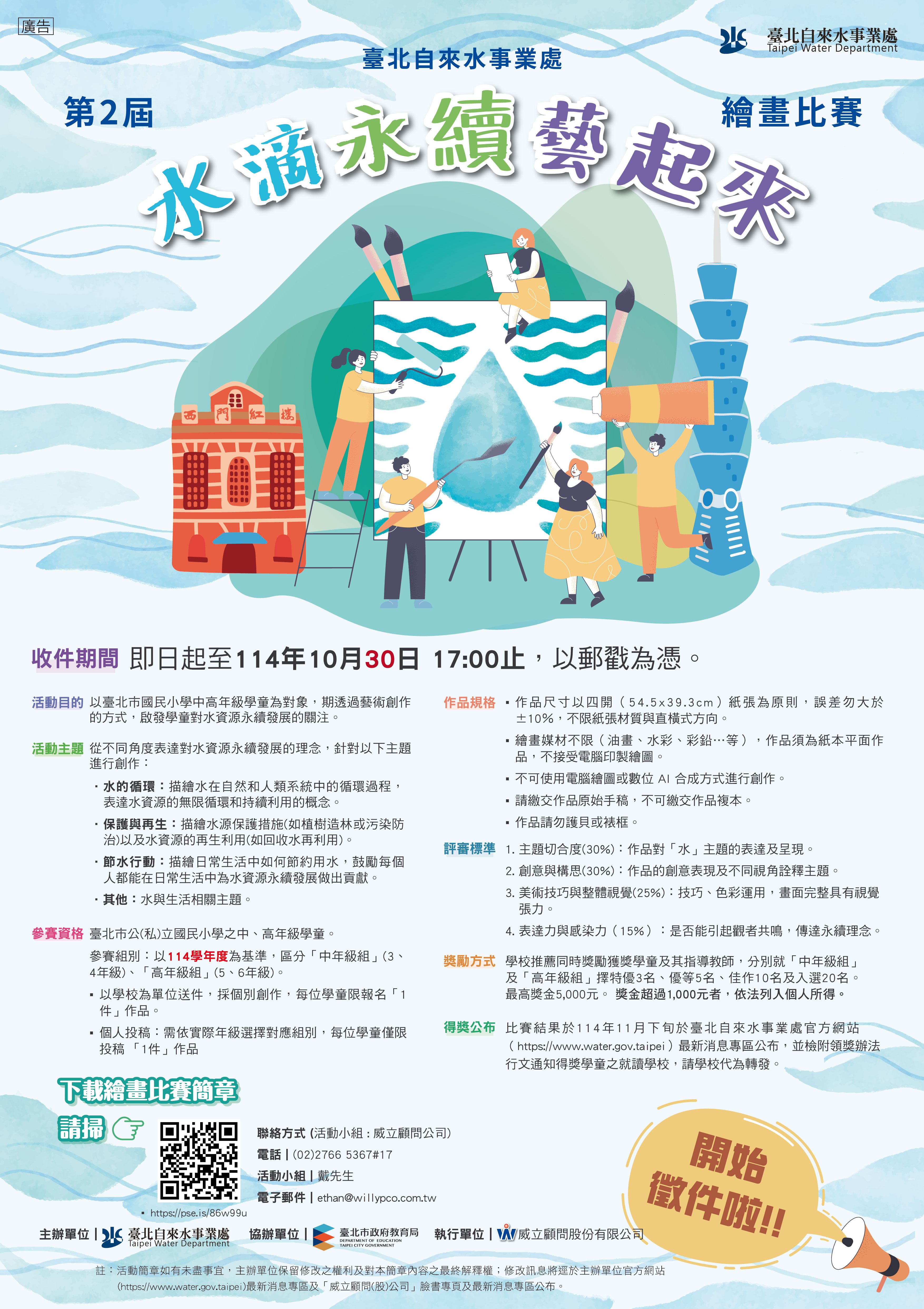 一、本處114年9月5日北市水企字第1146023119號函諒達。 二、因接獲許多學校反映時程作業時間不足,為擴大節水教育 成效,比賽報名收件期限自114年9月30日延至114年10月30 日。敬請轉知參賽師生,並於貴校電子布告欄及網站協助 宣傳。 三、檢送114年第2屆「水滴永續藝起來」繪畫比賽簡章(修正 版)及海報各1份(如附件)。