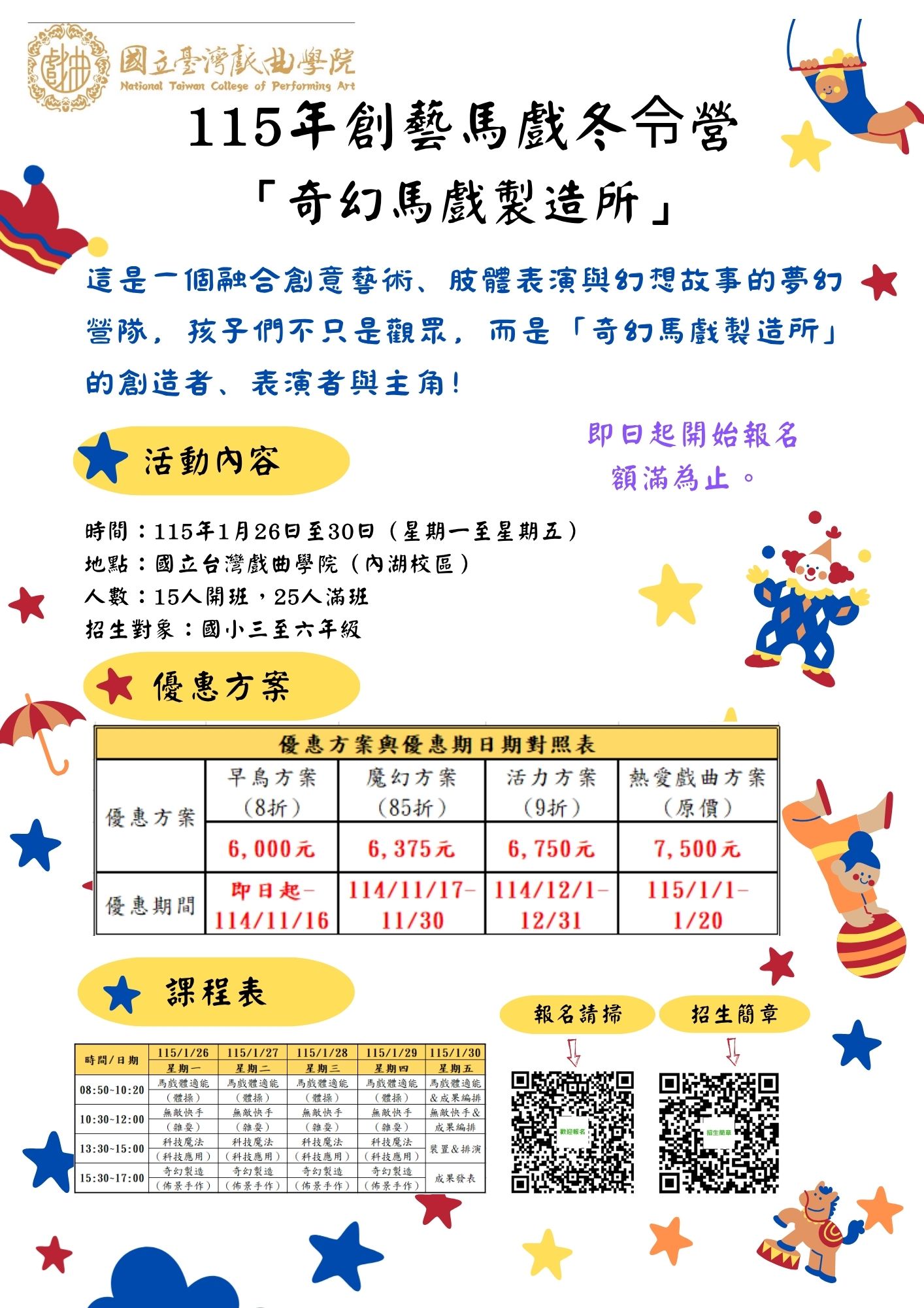 一、旨揭本案融合「馬戲體適能」、「無敵快手」、「科技魔 法」、「奇幻製造」課程,打造的一個充滿創意與魔法的 寒假冒險!在這裡,空中飛人與光影共舞,小丑的魔術球 由程式控制,舞台佈景來自你的親手創造!我們將帶領孩 子穿越傳統,融合科技,打造一個專屬於他們的、獨一無 二的未來馬戲舞台! 二、營隊相關訊息如下: (一)活動時間:115年1月26日(星期一)至30日(星期 五)。 (二)活動地點:國立臺灣戲曲學院內湖校區(台北市內湖區 內湖路二段177號)。(三)開班人數:15人。 (四)參加對象:國小三至六年級。 (五)報名期限:即日起額滿為止(25人滿班)。 三、早鳥報名享更多優惠(不含新生註冊費200元和材料費 2,000元): (一)早鳥方案:6,000元(原價8折)。 (二)魔幻方案:6,375元(原價85折) (三)活力方案:6,750元(原價9折)。 (四)熱愛戲曲方案(原價):7,500元。 四、檢附活動課程招生簡章及海報,敬請協助公告並轉知所屬 學生,至紉公誼。