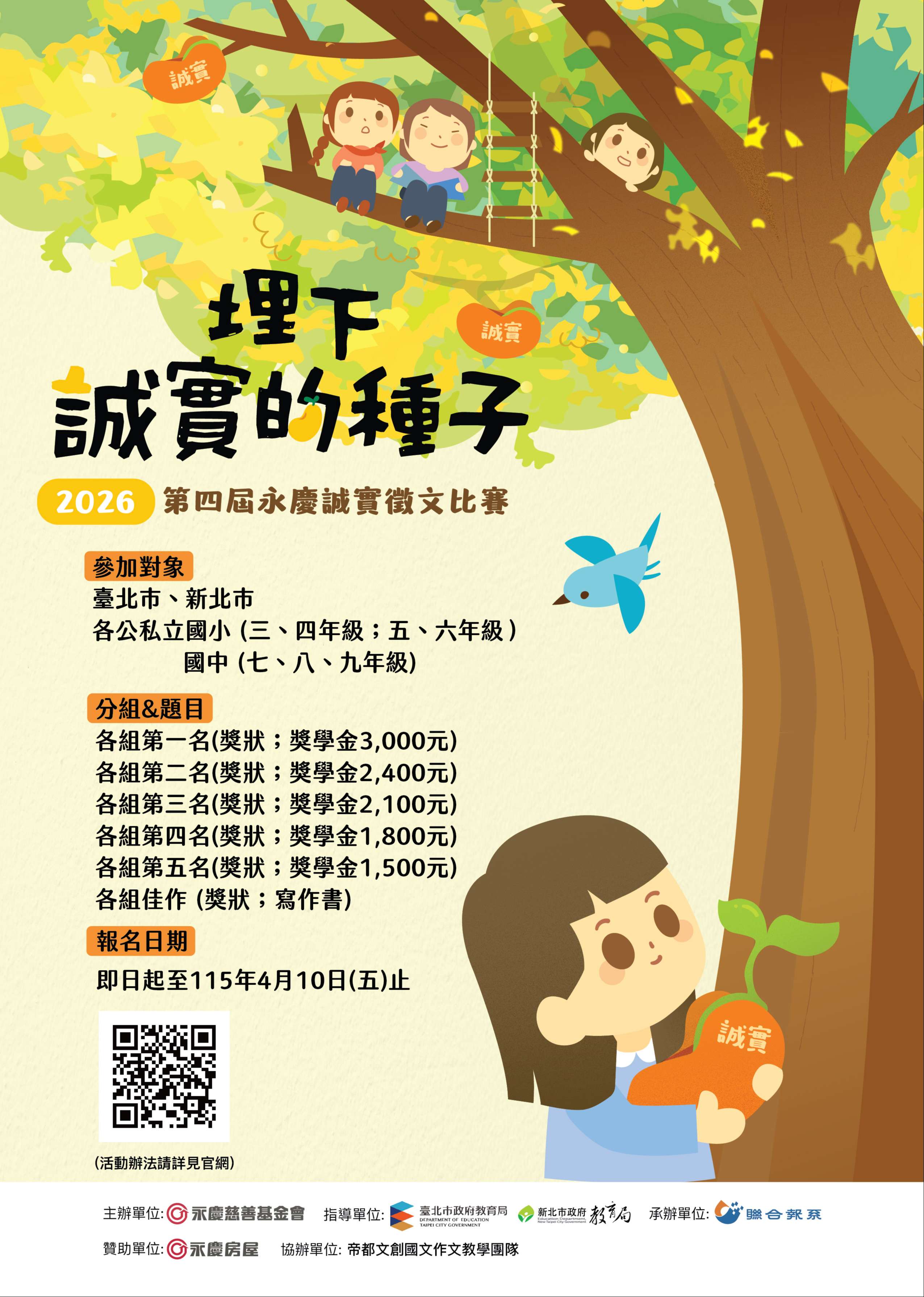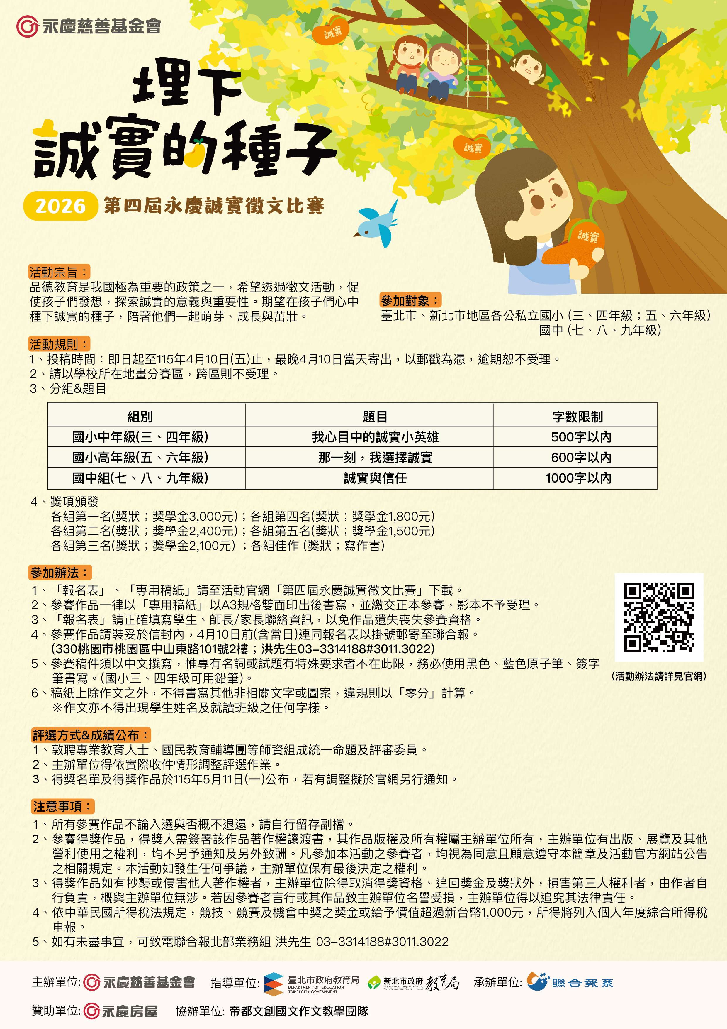 主旨:檢送2026「第四屆永慶誠實徵文活動」實施計畫、簡章、海報、報名表及專用稿紙各1份,請貴校協助公告並鼓勵學生踴躍報名參加,請查照。