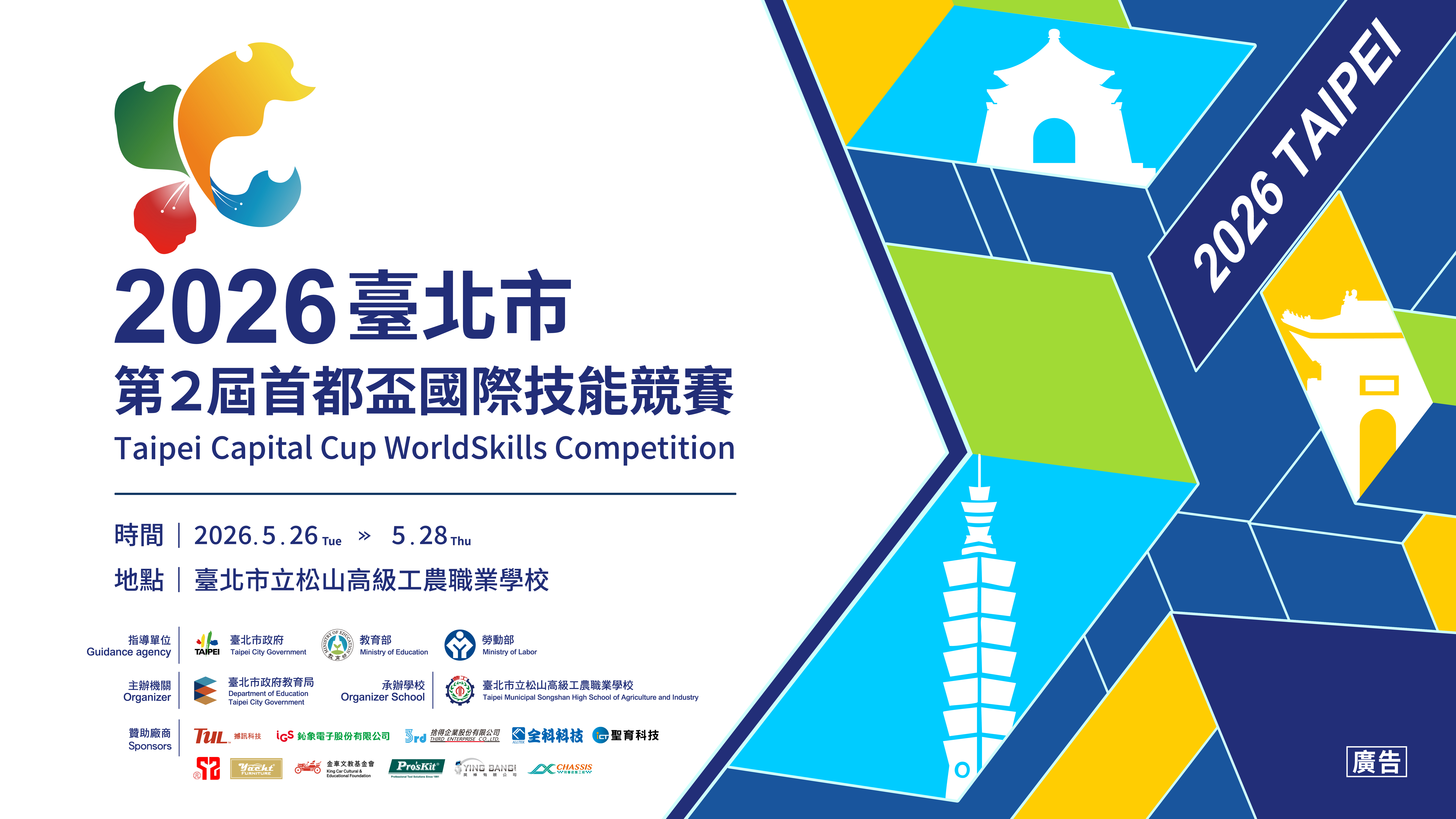 一、依據「2026臺北市第2屆首都盃國際技能競賽實施計畫」辦 理。 二、本局為讓本國學生能與國際技藝選手相互交流切磋,於 2026年5月26日至28日辦理第2屆首都盃國際技能競賽,競 賽職類包含工業機械、資訊網路建置、行動應用開發、商 務軟體設計、銲接、漆作裝潢、汽車技術、冷凍空調、工 業4.0、數位建設BIM等10職類。