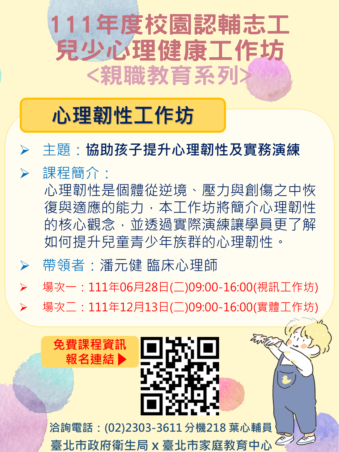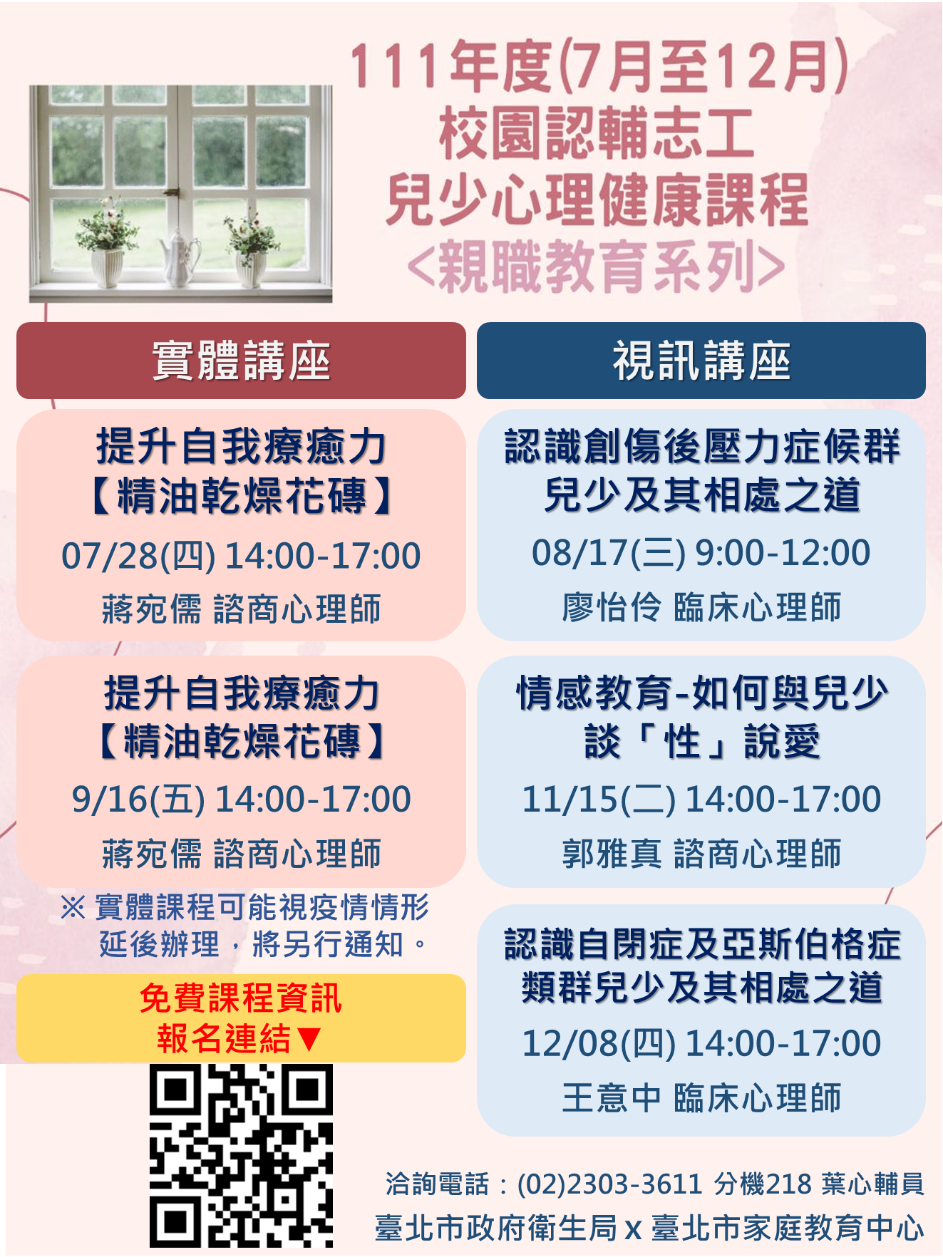 為增進校園認輔志工兒少心理衛生相關知能及家長照顧特殊兒少之親職功能,北市衛生局辦理旨揭課程,歡迎認輔志工及家長報名參加,報名資訊詳如附件。