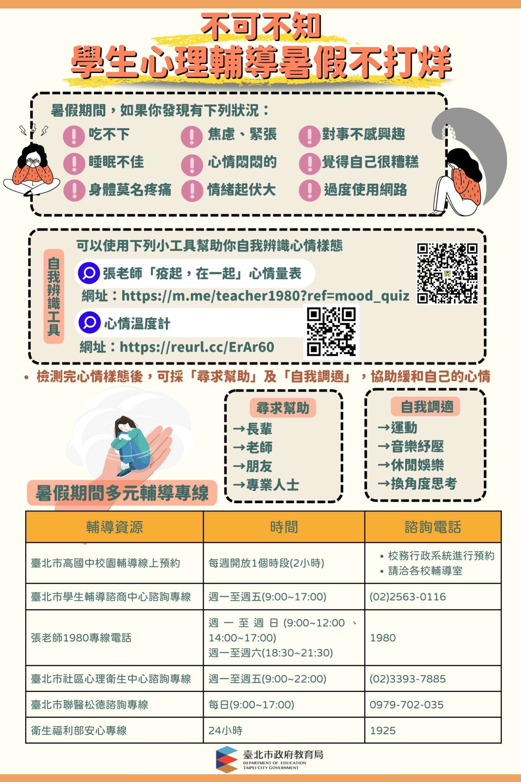 「疫起,在一起~青少年心理健康計畫」:本局與張老師基金會合作,結合張老師網路平台建置心情檢測站,學 生於線上實施心情檢測後可即時取得檢測結果,並選擇不同舒壓方式或連結線上諮詢服務(1980專線電話、網路輔導),由專人提供服務。網址:https://www. facebook.com/teacher1980。