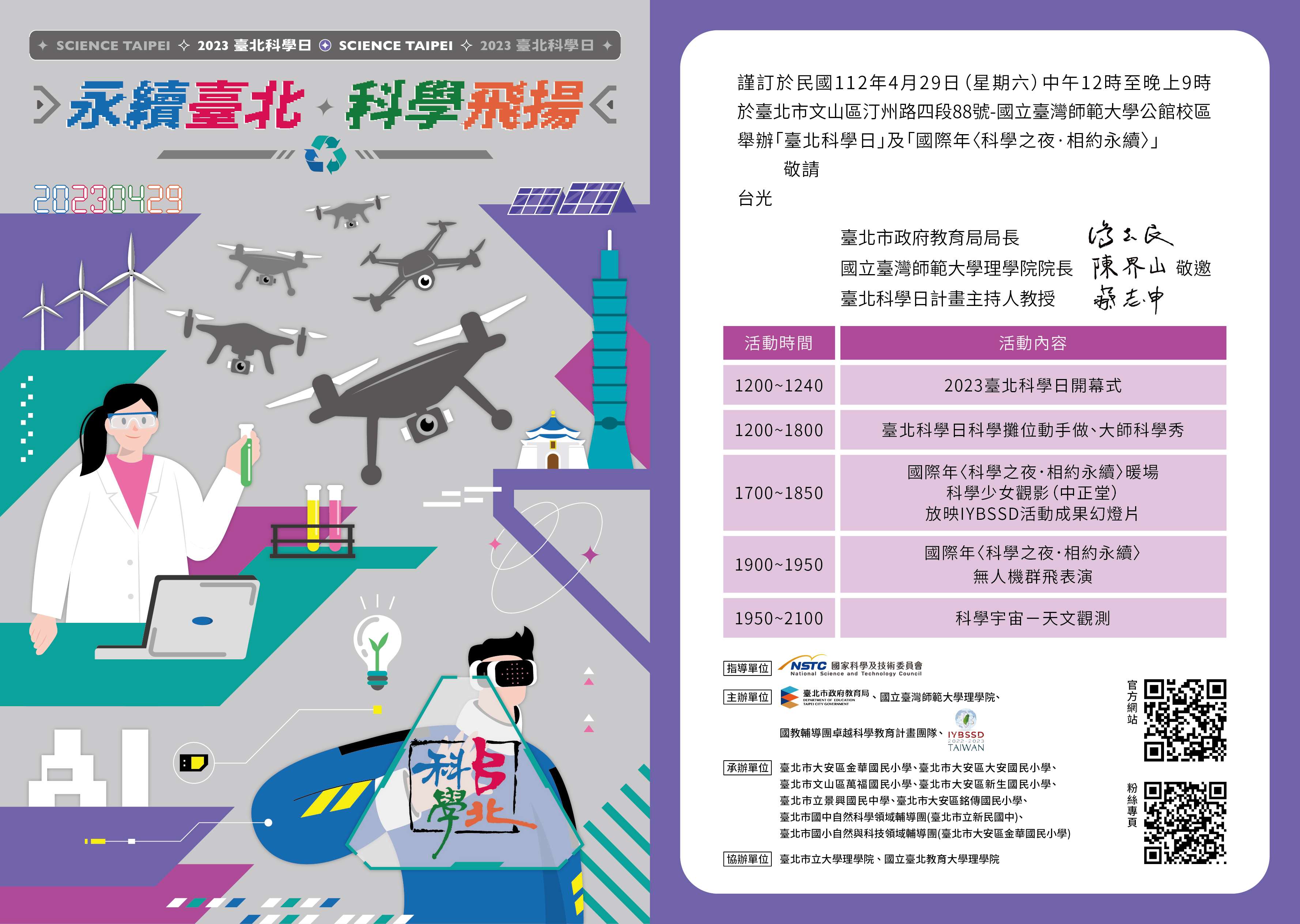 一、112年4月29日(星期六)假師大公館校區 辦理科學體驗實作活動,並響應聯合國教育科學及文化組 織「基礎科學促進永續發展國際年」理念,藉本活動「永續臺北—科學飛揚」之主題,彰顯本市對於推動科學教育 的重視。