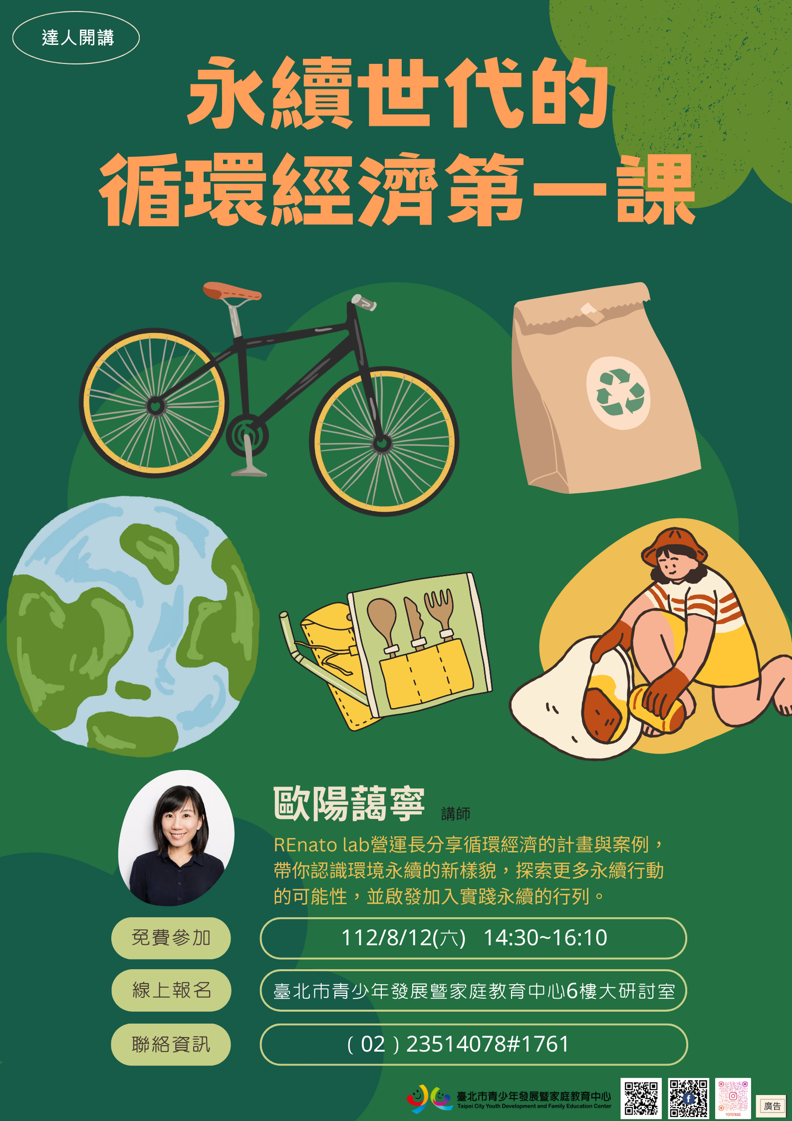 (一)90字:臺北市青少年發展暨家庭教育中心8月12日14:30 舉辦達人開講「永續世代的循環經濟第一課」,REnato lab營運長歐陽藹寧老師與您分享她踏上致力於實踐永續的心路歷程,以及過程中的體驗。活動免費,詳見青發 家教中心官網。