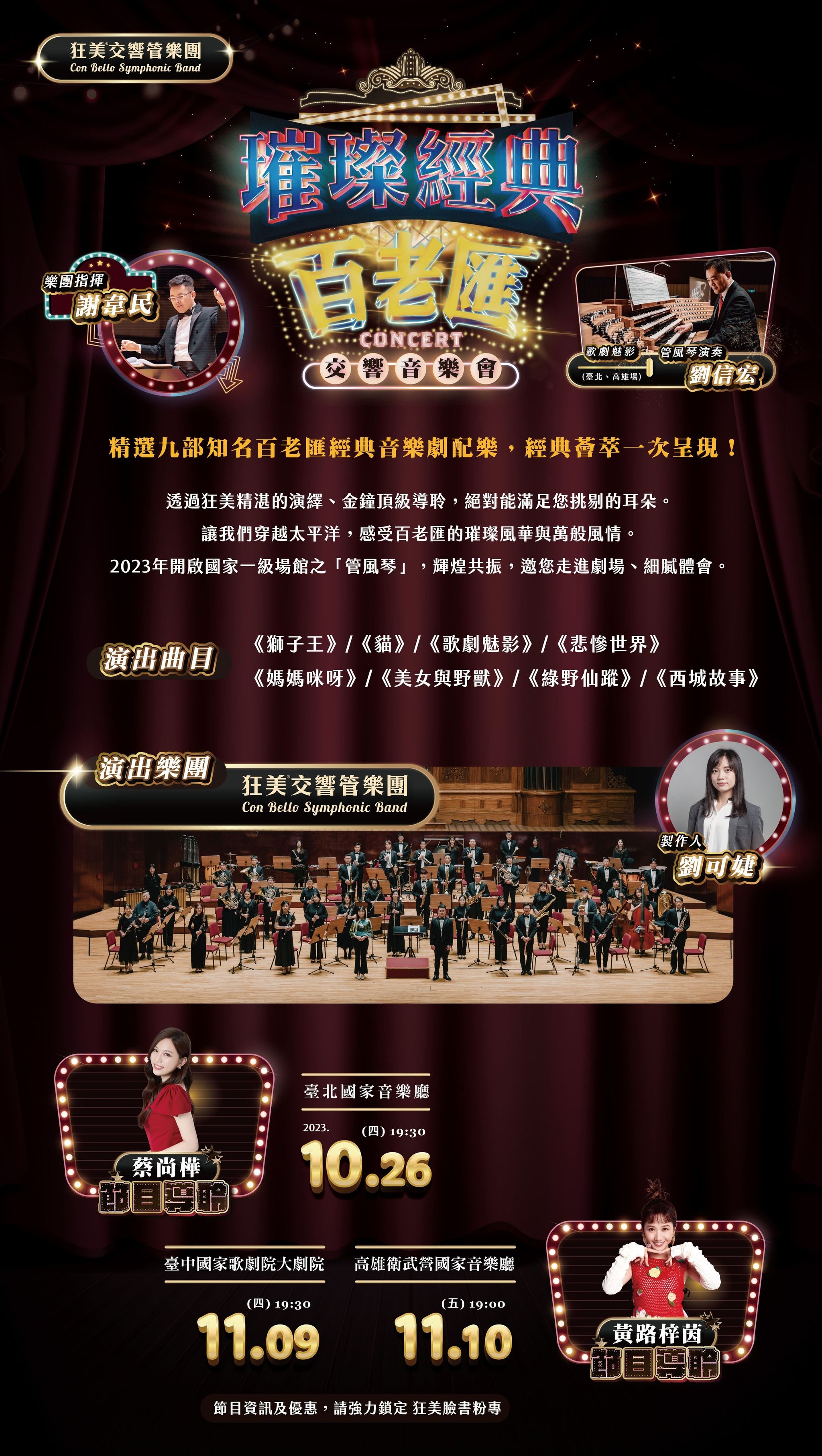 一、節目介紹:精選九部百老匯經典音樂劇配樂,網羅歌劇魅 影、悲慘世界、媽媽咪呀、貓、美女與野獸、獅子王、綠 野仙蹤、西城故事...等知名劇碼,經典薈萃一次呈現!經 由狂美精湛的演繹、金鐘導聆,絕對能滿足您挑剔的耳 朵!讓我們穿越太平洋,感受百老匯的璀璨風華與萬般風 情。