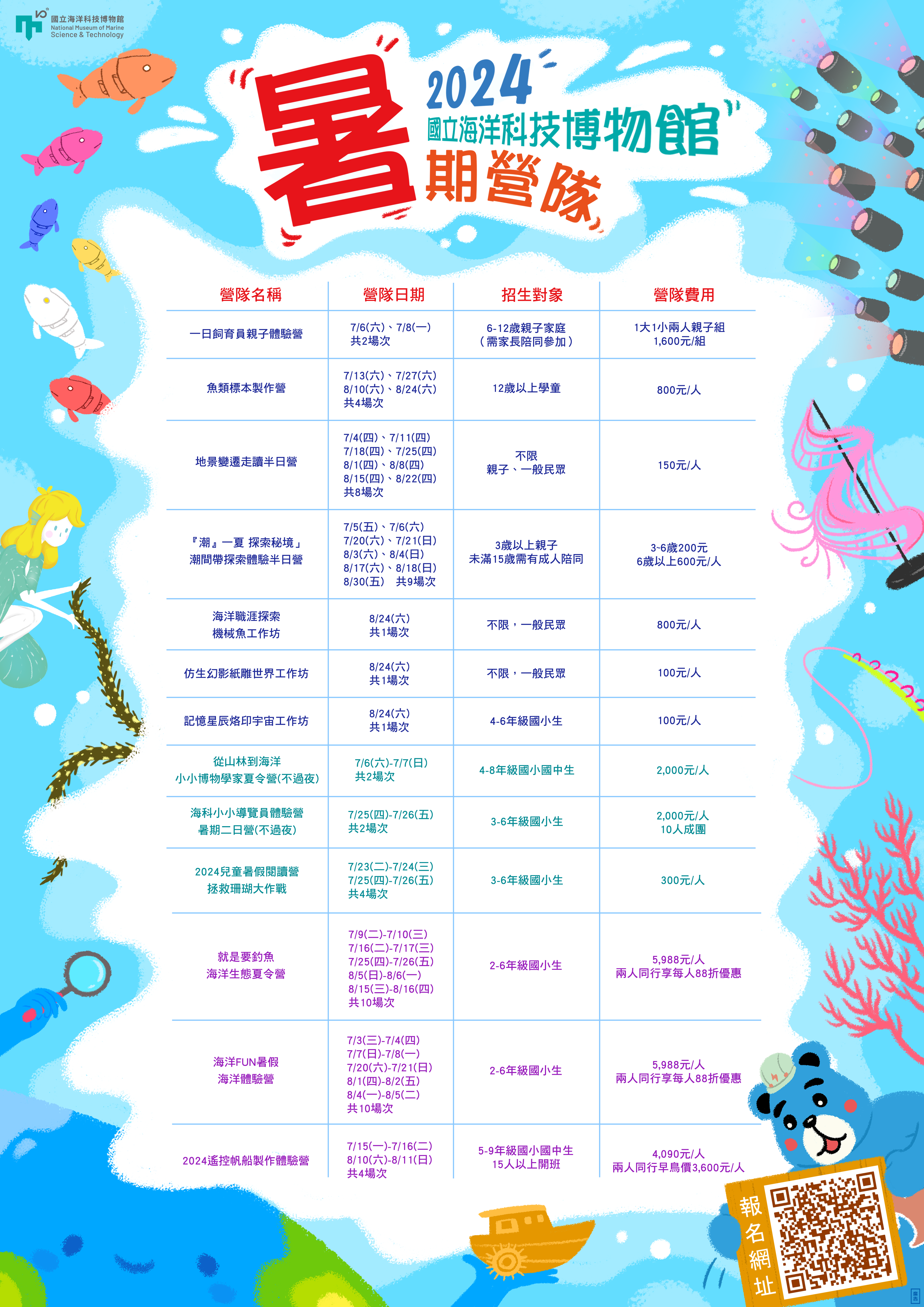 一、本館具有山海的自然景觀之外,亦有海洋科技、文化、生 物與環境等課程資源,為提供全民優質的課程體驗,於113 年7月3日至8月30日期間,推出一系列暑期營隊活動,希望 全民可以在沉浸式的情境中,度過一個不一樣的暑假。