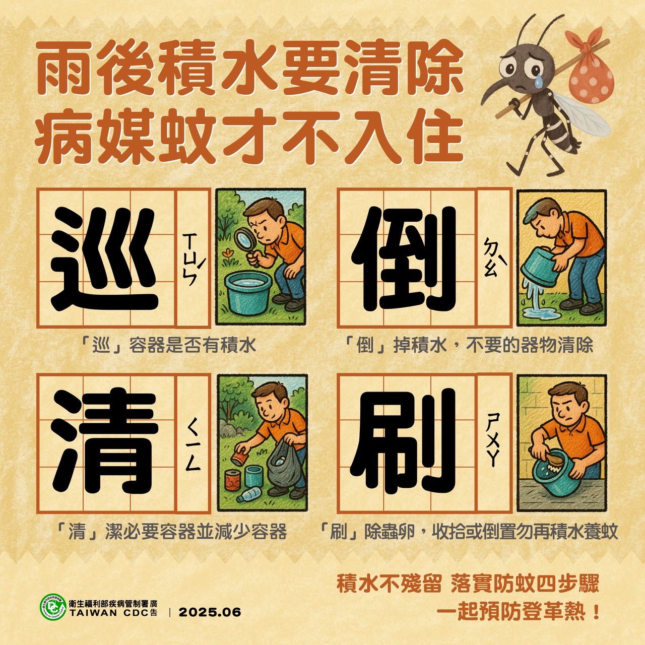 四、檢附疾管署「雨後巡倒清刷」之衛教宣導圖卡,請運用各式管道廣為宣導運用,以提高民眾登革熱防治識能。