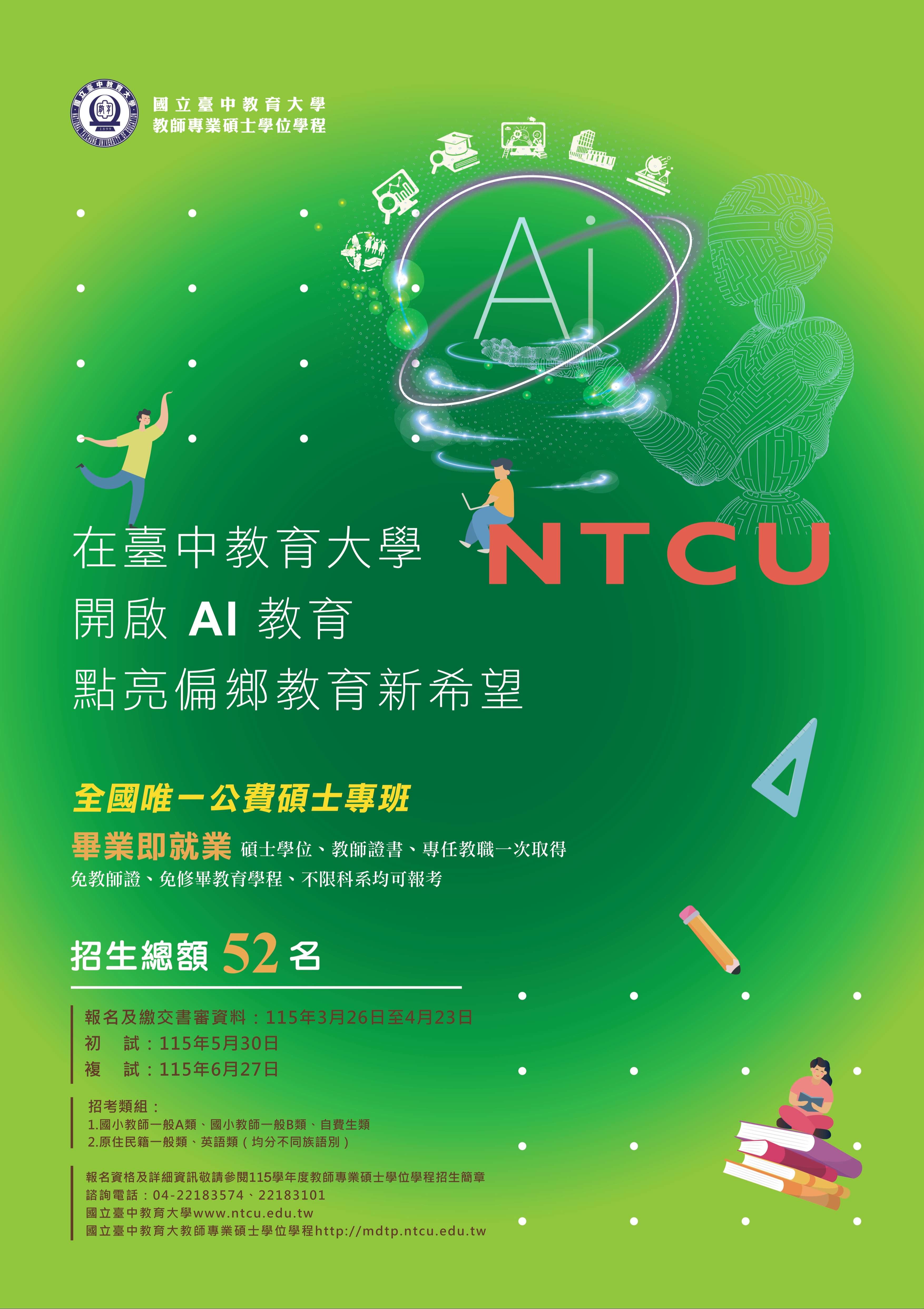 二、115學年度招生考試自115年3月26日至4月23日報名(含繳交書審資料),5月30日初試,6月27日複試,招生簡章請參閱本校招生資訊網(https://as.ntcu.edu.tw/)。