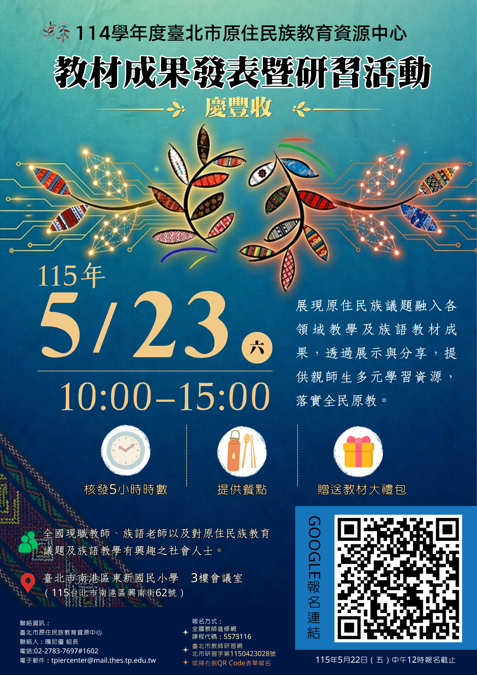 二、為展現本市原住民族語及議題融入之數位與實體教材研發成果,透過展示與教學分享,提供教師多元備課資源,提升教材應用與教學效益。